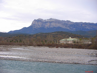 El rio Cinca por su paso en L'Ainsa, al fondo la peña Montañesa